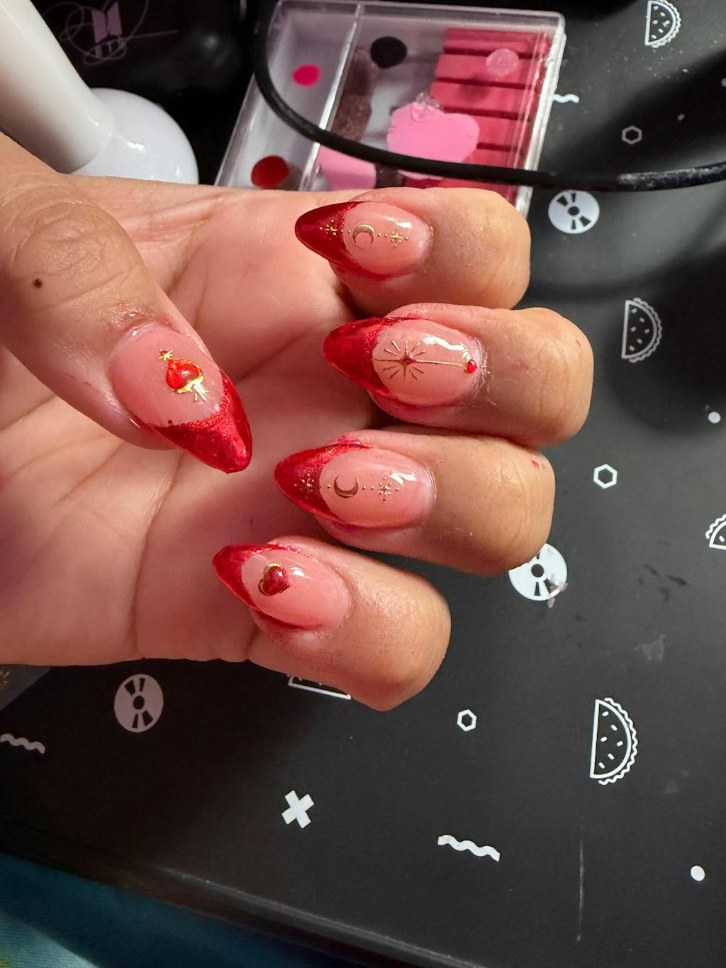 Let your manicure align with the cosmos using our Starcrossed Hearts nail art stickers. This enchanting sheet tells a story of celestial romance through vibrant ruby red hearts protected by shimmering gold starbursts and mystical crescent moons. Detailed with dainty gold bows and twinkling star accents, these bejeweled decals bring a regal, heavenly charm to your fingertips. They are the perfect choice for a unique Valentine’s Day look or any set that needs a touch of otherworldly magic.