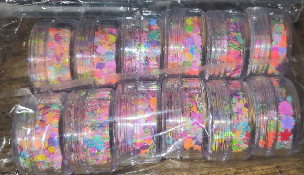 Super fun iridescent neon glitter mix in 12 different shapes! Shapes include hex, dots, stars, marquise, Mickey mouse, flowers, butterfly, hearts, square and diamond. A great selection of unique glitters for adding a pop of color to your nails.